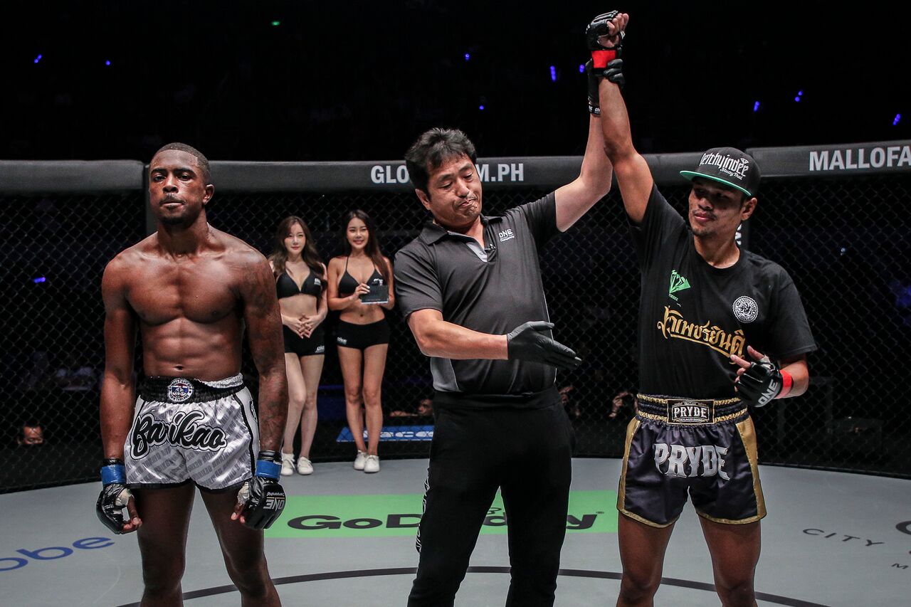 Chamuaktong conquered Pinas by connecting on a plethora of elbows and knees from close quarters. After three rounds, the Thai fighter had his hand raised by referee Atsushi Onari as the winner via unanimous decision.