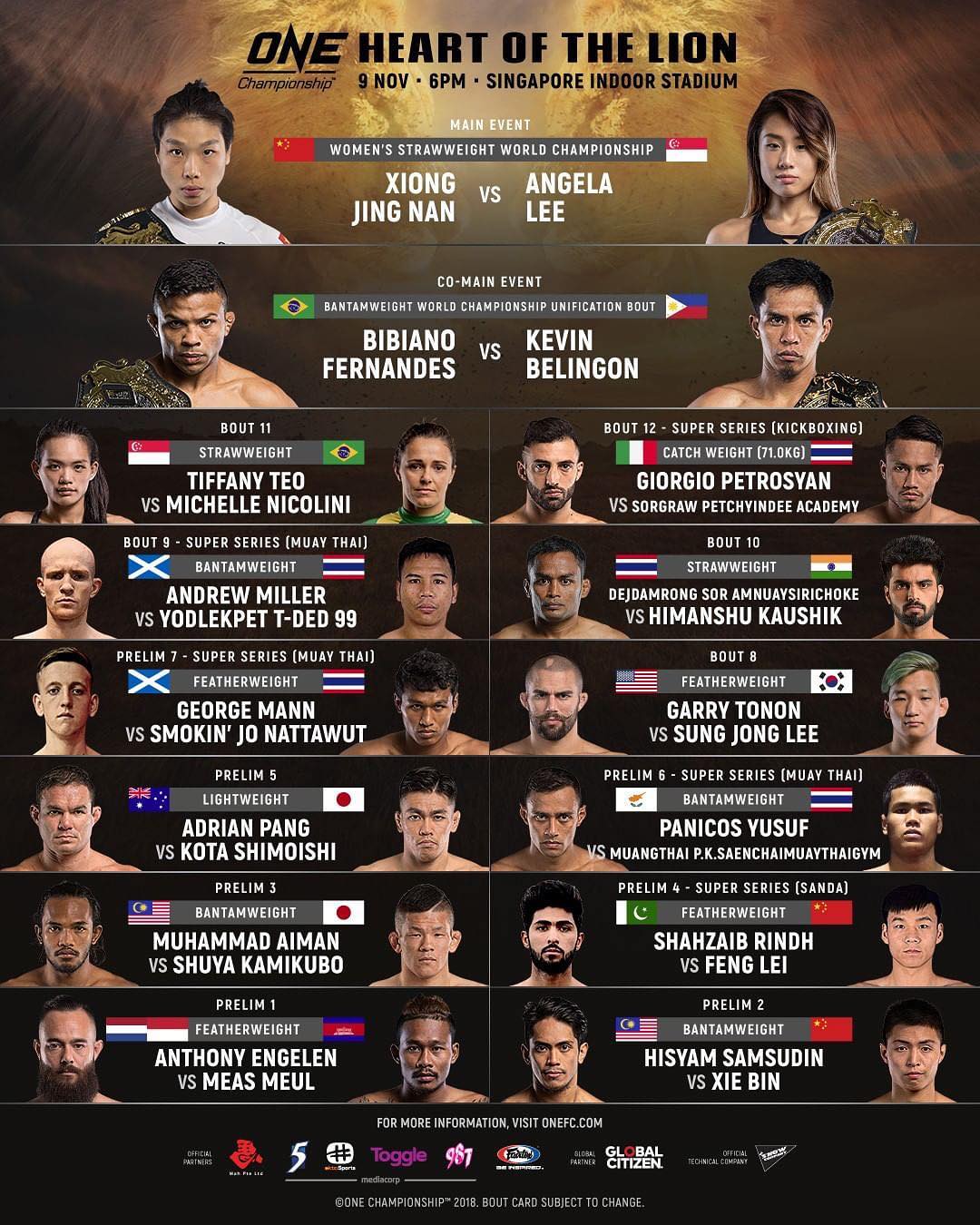 Here is the complete fight card for “ONE: Heart of the Lion” featuring nine MMA bouts and five ONE Super Series contests: