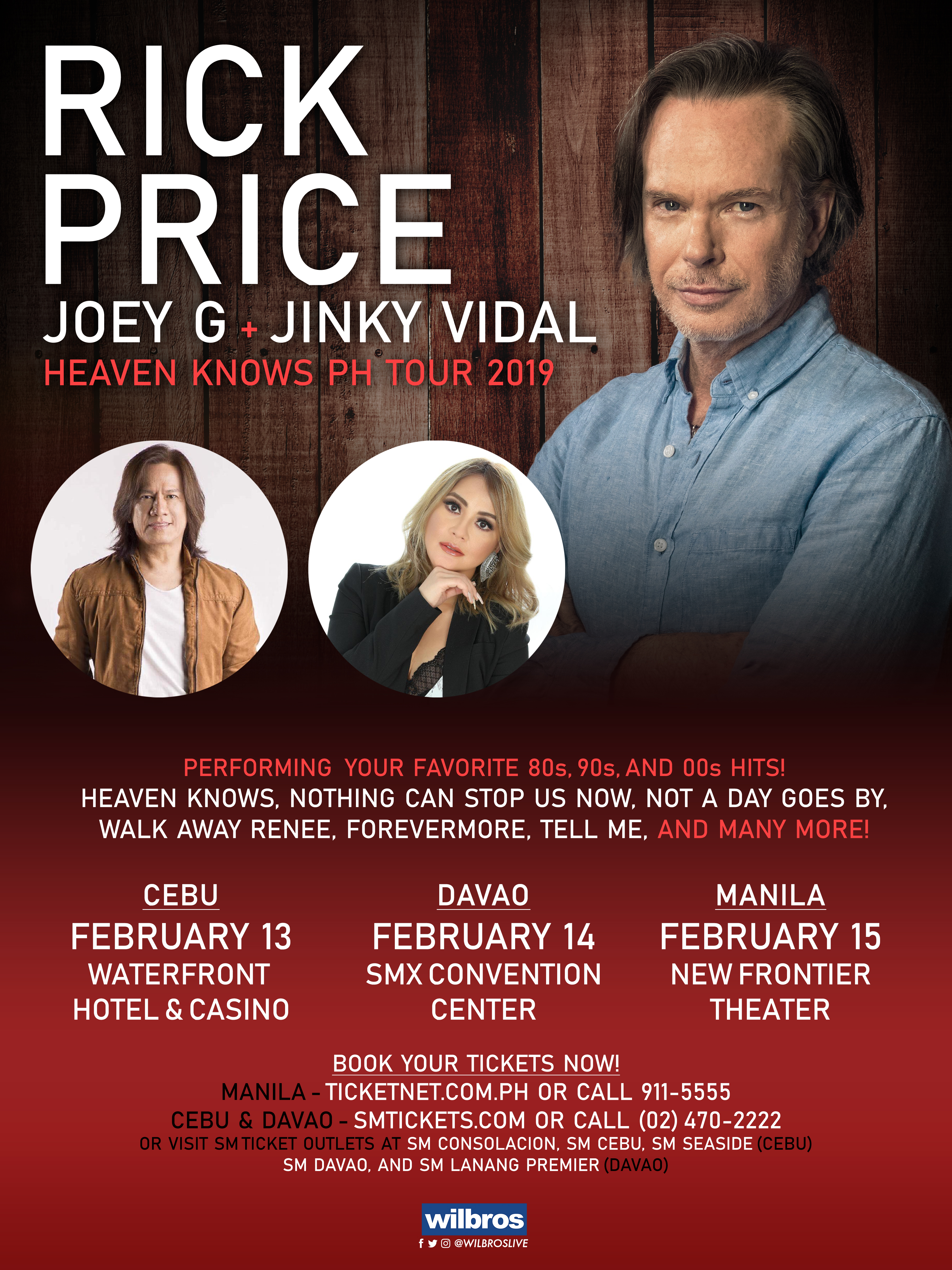 A Valentine event concertgoers should not miss, “Heaven Knows PH Tour 2019” will be focusing on all hits from the 1980s, 1990s and 2000s. Price, Joey G and Vidal will perform on February 13, 2019 in Cebu, on February 14, 2019 at the Waterfront Hotel and Casino in Davao and on February 15 at the SMX Convention Center in Pasay City, Metro Manila at the New Frontier Theater in Quezon City, Metro Manila.