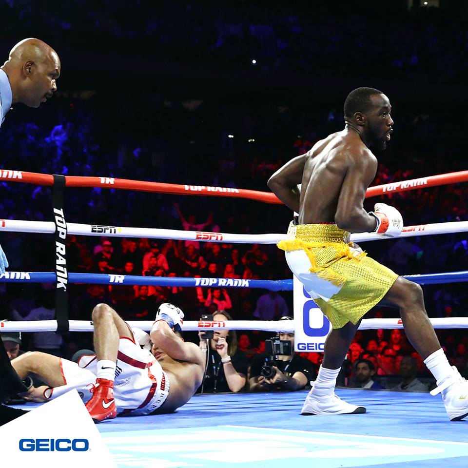 Top Rank promoted the event in association with Matchroom Boxing and Khan Promotions. Meanwhile, here is a ringside look at Crawford’s first-round knockdown of Khan: