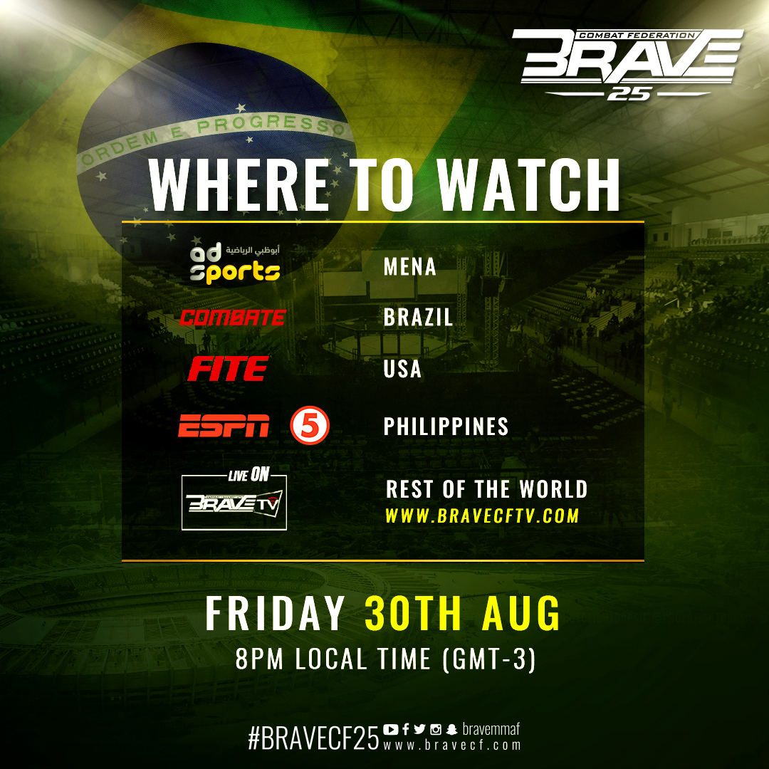 However, fans from MENA region (Middle East and North Africa), United States, Brazil, and the Philippines will be able to watch BRAVE 25 only through other channels. In the MENA region, Abu Dhabi Sports 4 will showcase the event, while ESPN5 broadcasts the fights in the Philippines, FiteTV for the American fans, and Combate channel for Brazil.