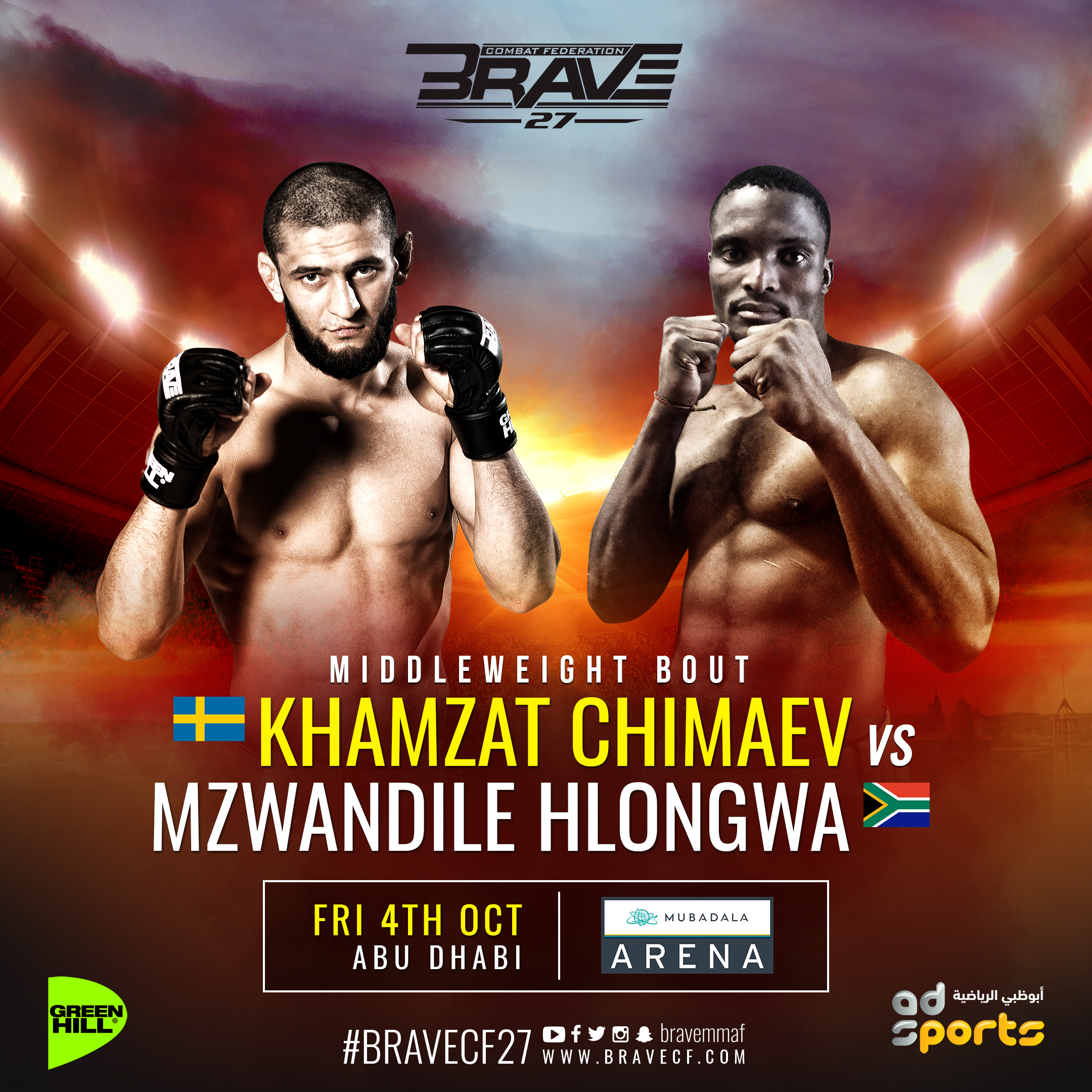 Mzwandile Hlongwa, 29, of Durban, KwaZulu-Natal, South Africa will make his Brave Combat Federation debut at “Brave 27.” He will face his fellow undefeated mixed martial artist Khamzat “Borz” Chimaev, 25, of Stockholm, Sweden in the middleweight division.