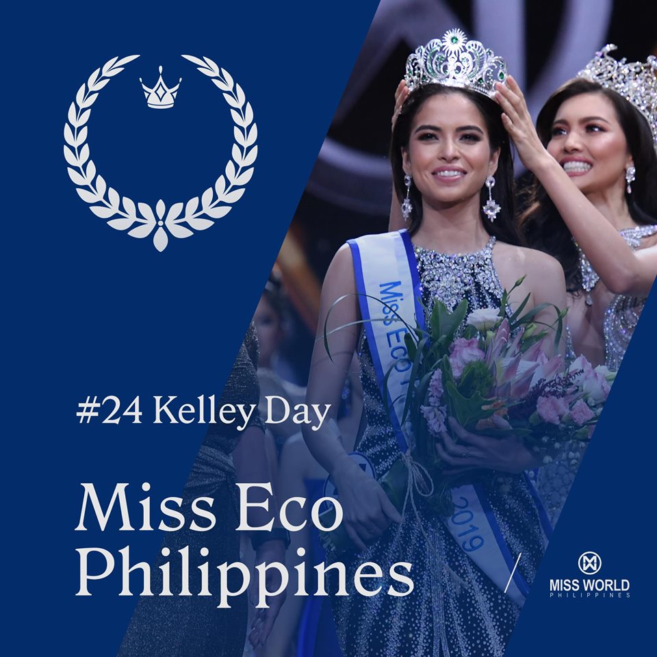 Actress Kelley Day, 24, was crowned Miss Eco Philippines 2019 on September 15, 2019. She succeeded Miss Eco Philippines 2018 Maureen Montagne, 26, of Batangas, Philippines.