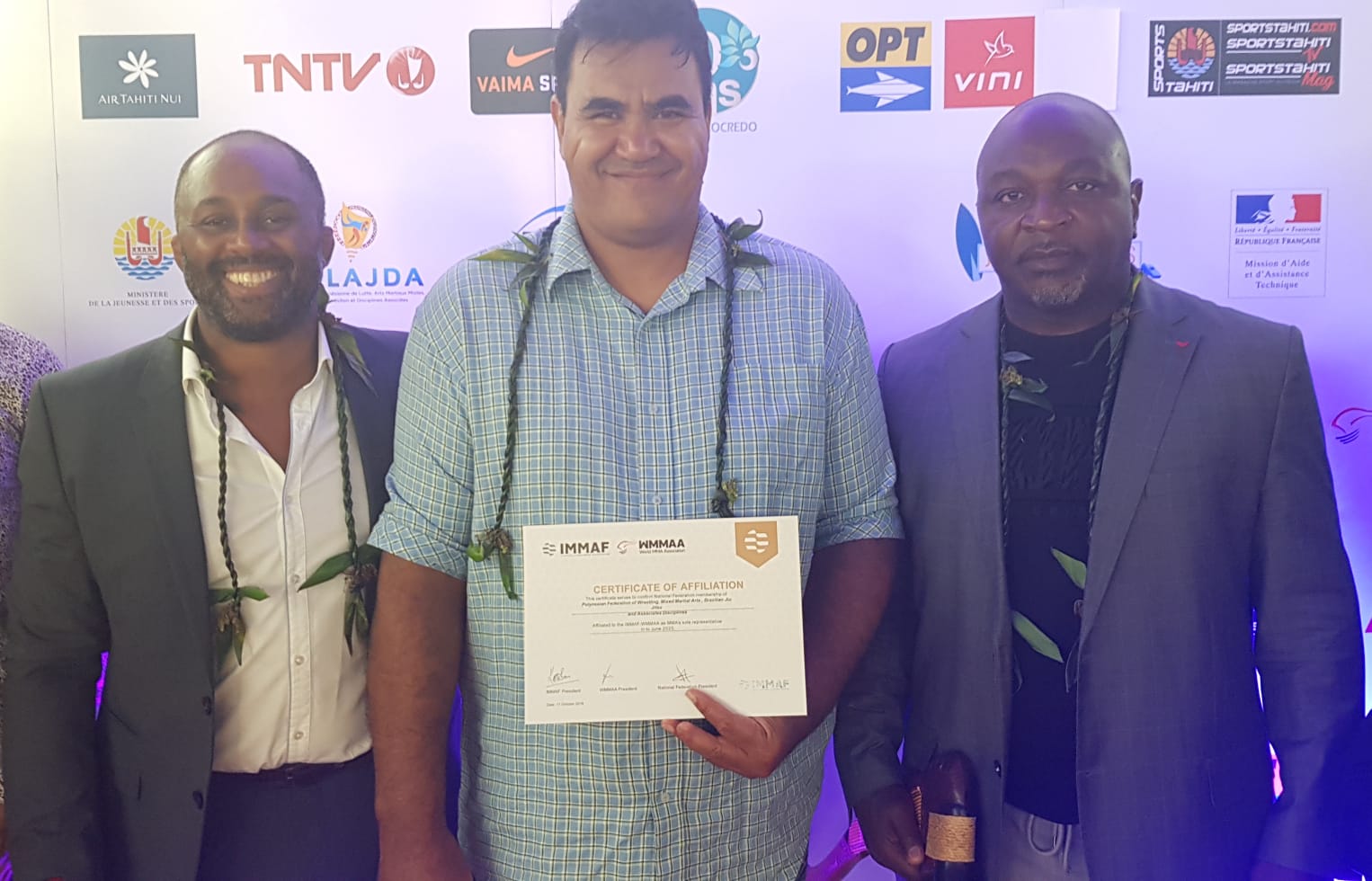 The Polynesian Federation of Wrestling and Associated Disciplines, or Fédération Polynésienne de Lutte, d’arts Martiaux Mixtes, Jiu Jistu Brésilien et Disciplines Associées (FPLAJDA), has been recognized by the International Mixed Martial Arts Federation (IMMAF). The membership was announced at a press conference on October 11, 2019 in Tahiti.
