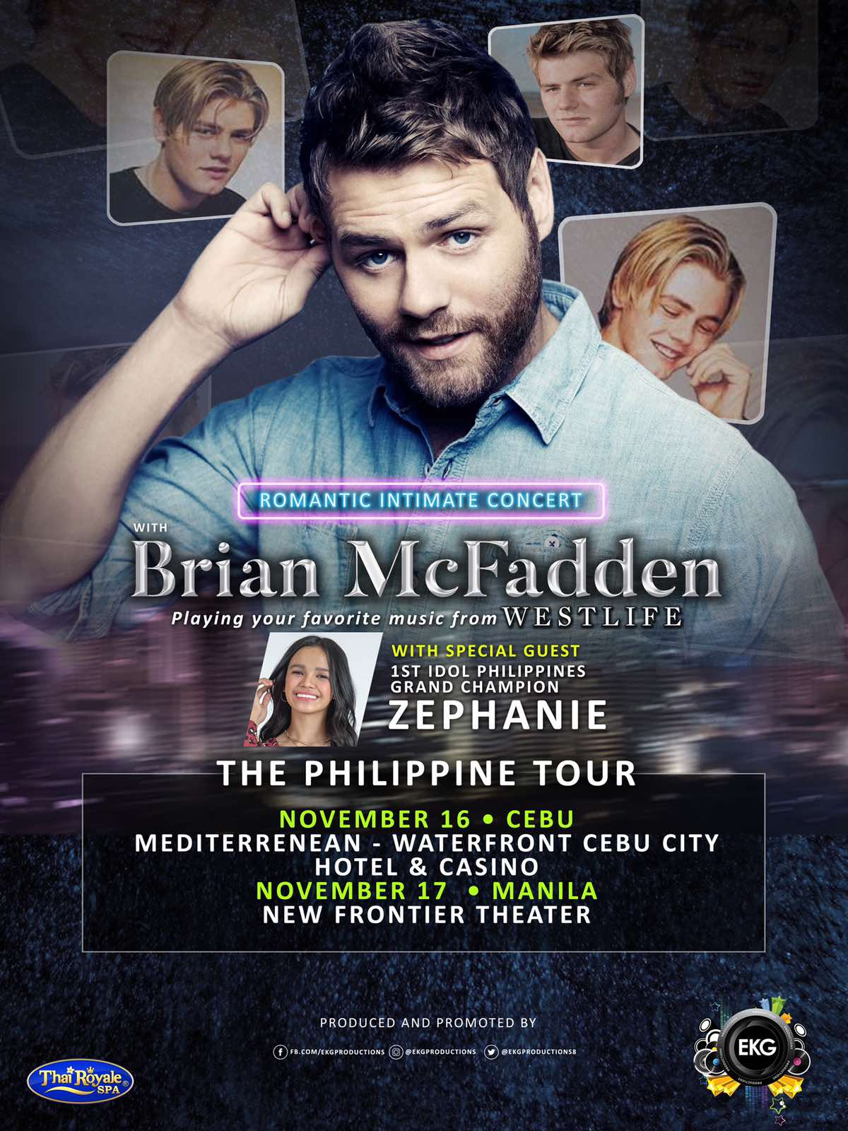 Brian McFadden, 39, of Ireland is set to perform Westlife songs in a pair of intimate concerts in the Philippines. The Irish singer-songwriter will be at the Mediterranean Ballroom of Waterfront Cebu City Hotel and Casino in Cebu on November 16, 2019 and at the New Frontier Theatre of the Araneta Center in Quezon City, Metro Manila, Philippines on November 17, 2019.