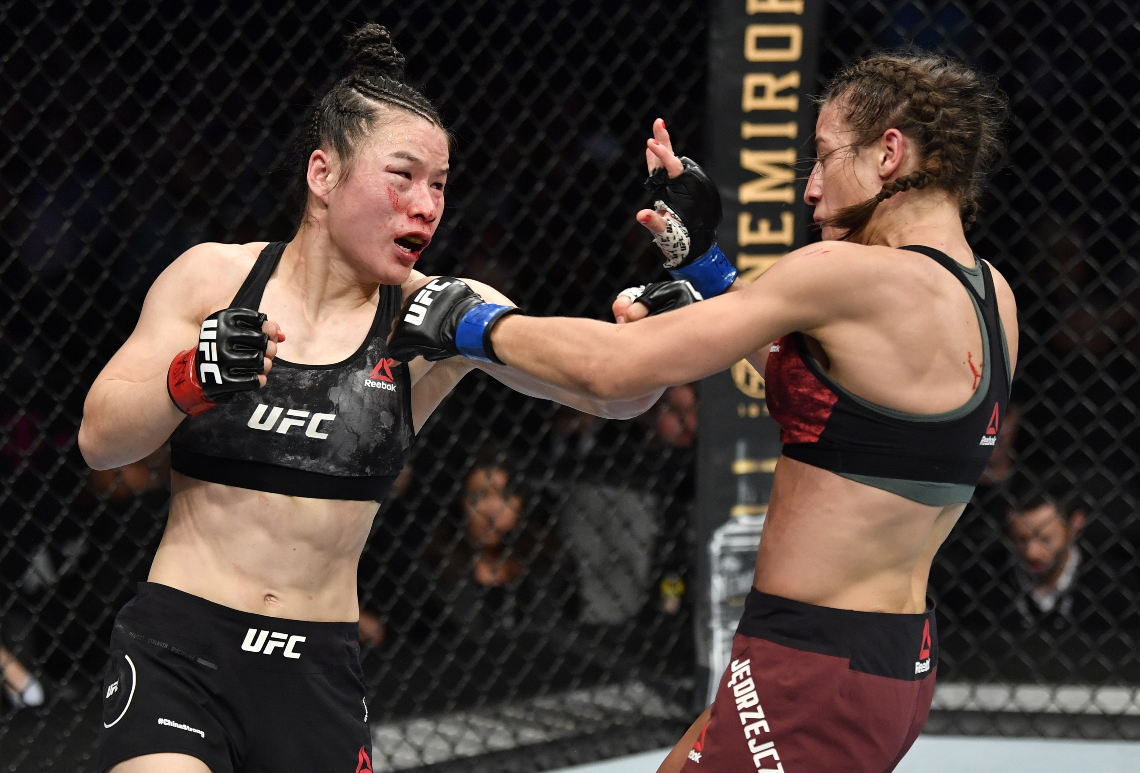 Locked up against the fence, Zhang landed elbows and Jedrzejczyk responded with knees in the second round. The defending champion raised a welt on her challenger’s head in the third round but the latter responded by finishing the round strong.