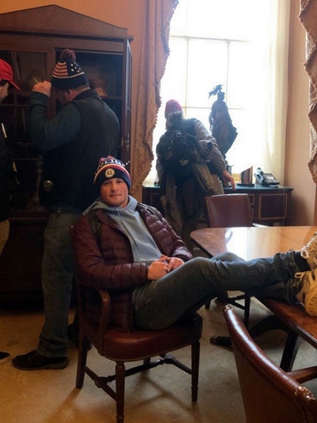 - He went to the U.S. Capitol building in Washington, D.C., USA on January 6, 2021. That day, Donald Trump supporters breached the building while a joint session of Congress was certifying the vote of the Electoral College and affirming Joe Biden‘s victory in the 2020 presidential election. He livestreamed his entrance into the building, had someone take a photo of him while he was inside Nancy Pelosi‘s office and recorded a video of himself stealing a bottle of Corona beer out of a refrigerator. He took to Snapchat to share photos of himself taken inside the U.S. Capitol building that day. The photos helped authorities track him. (a)